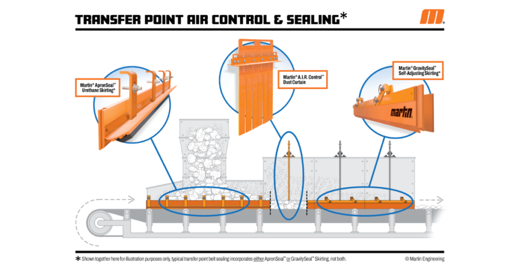 The global leader in belt conveyor technology, Martin Engineering, introduced the next generation of safe and effective transfer point dust control equipment. After rigorous testing across many applications, the Martin® ApronSeal™ Urethane Skirting, GravitySeal™ Self-Adjusting Urethane Skirting, and the A.I.R. Control™ Dust Curtain outperformed similar products in tackling fugitive dust and spillage. Retrofitted onto existing transfer points, the system uses no energy to control airborne dust. With safety features for fast external servicing, the designs deliver greater performance at a lower operating cost.