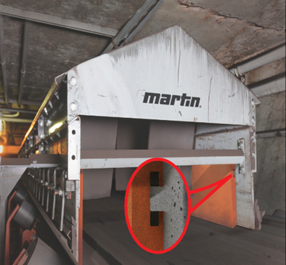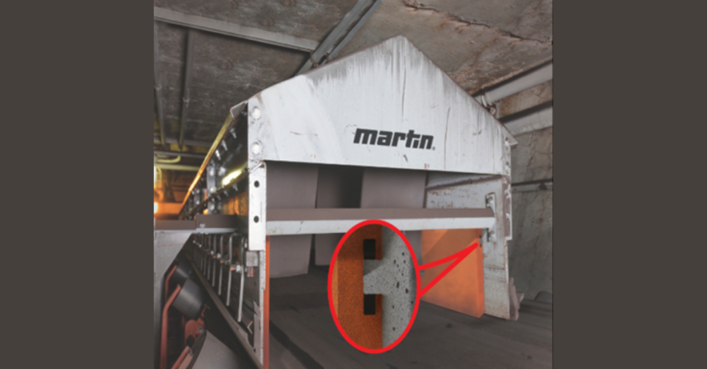 Martin® Skirtboard Liner – Installed inside conveyor transfer point skirtboards, Martin® Skirtboard Liners absorb impact and abrasion by creating a dam to shield the sealing system from the weight of the material load, prolonging the life of the seal. Skirtboard Liners feature a steel plate molded inside the urethane to prevent bond issues. The unique T-slot mounting interface allows the liner to be adjusted from outside the chute wall, eliminating the need for confined space entry. Liners are also stackable to line higher drop chutes.