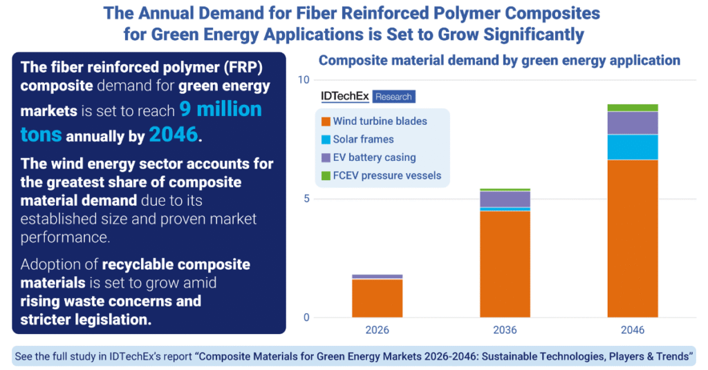 IDTechEx predicts that composite demand in green energy applications alone will reach 9 million tons annually by 2046, underlining both the scale of the opportunity and the urgency of addressing sustainability challenges.