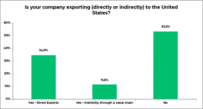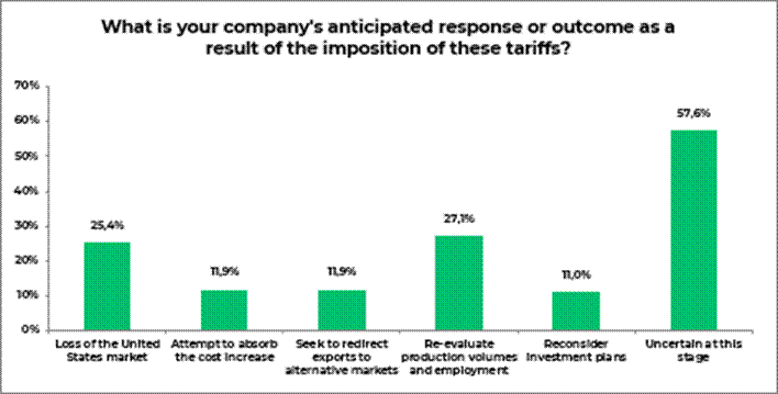 • Several respondents indicated that if the tariffs persist, they would be forced to reduce their workforce or even close operations. In addition, some companies have had to reconsider or halt planned investments. One notable case involved the redirection of equipment and production intended for the United States to another subsidiary, leading to the effective shutdown of a new South African facility.