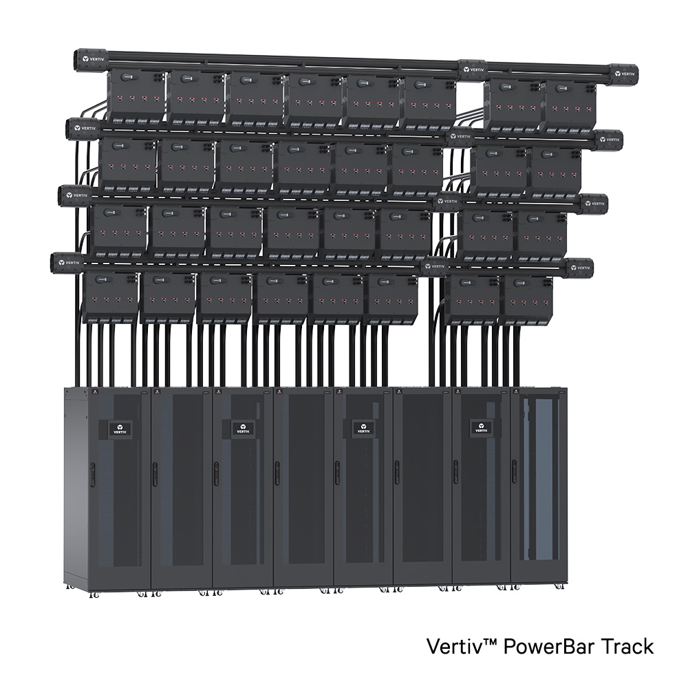 The Vertiv™ PowerBar Track double stack configuration delivers flexible overhead power distribution for modern compute environments.