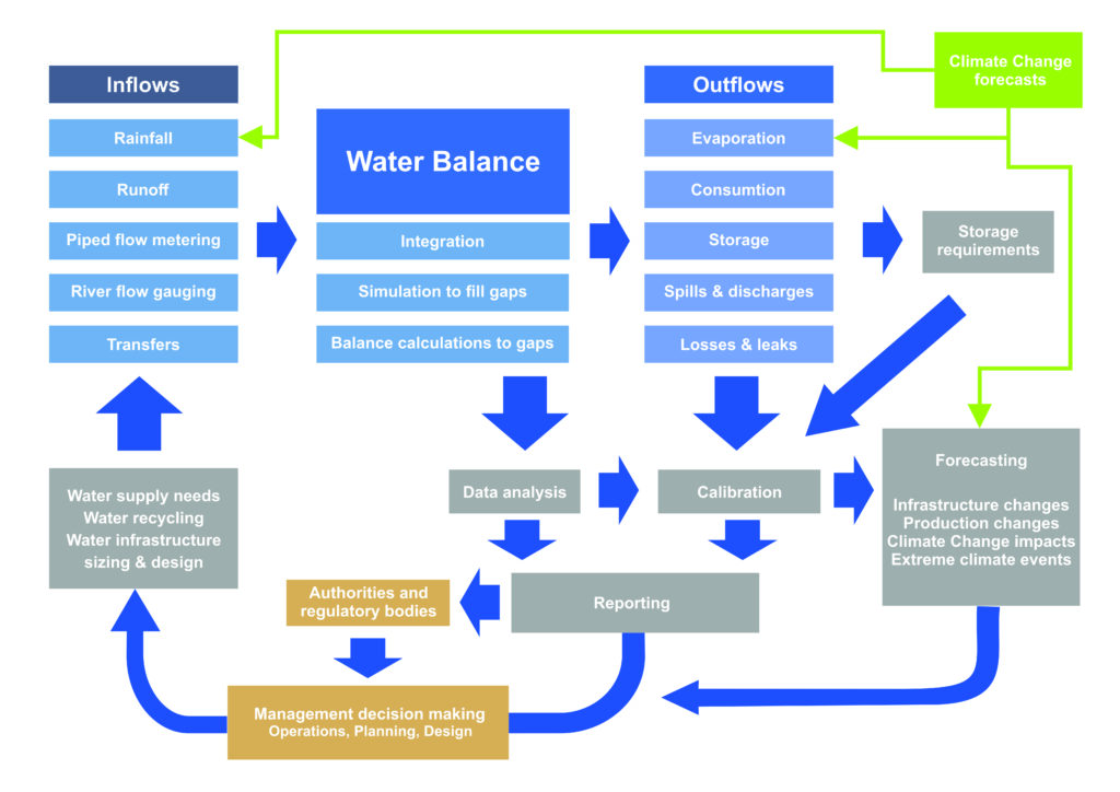 A water balance accounts for water flow entering or leaving a site, whether through rainfall, groundwater, run-off, evaporation, piping networks or storage facilities.